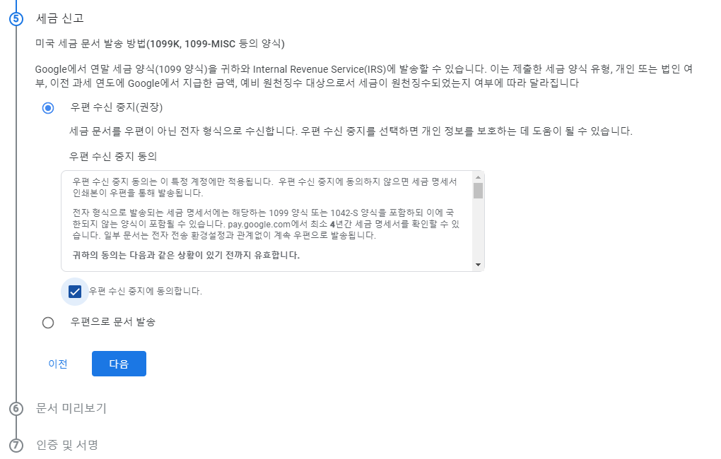 양식 작성 중 '조세 조약 혜택을 신청하시겠습니까?'라는 질문이 나옵니다. 대부분의 개인 사용자는 '아니오'를 선택할 수 있으나, 사업자 등록번호가 있거나 특정 조건을 충족하여 조세 조약 혜택을 받을 수 있는 경우에는 '예'를 선택하여 세금 감면 혜택을 신청할 수 있습니다.