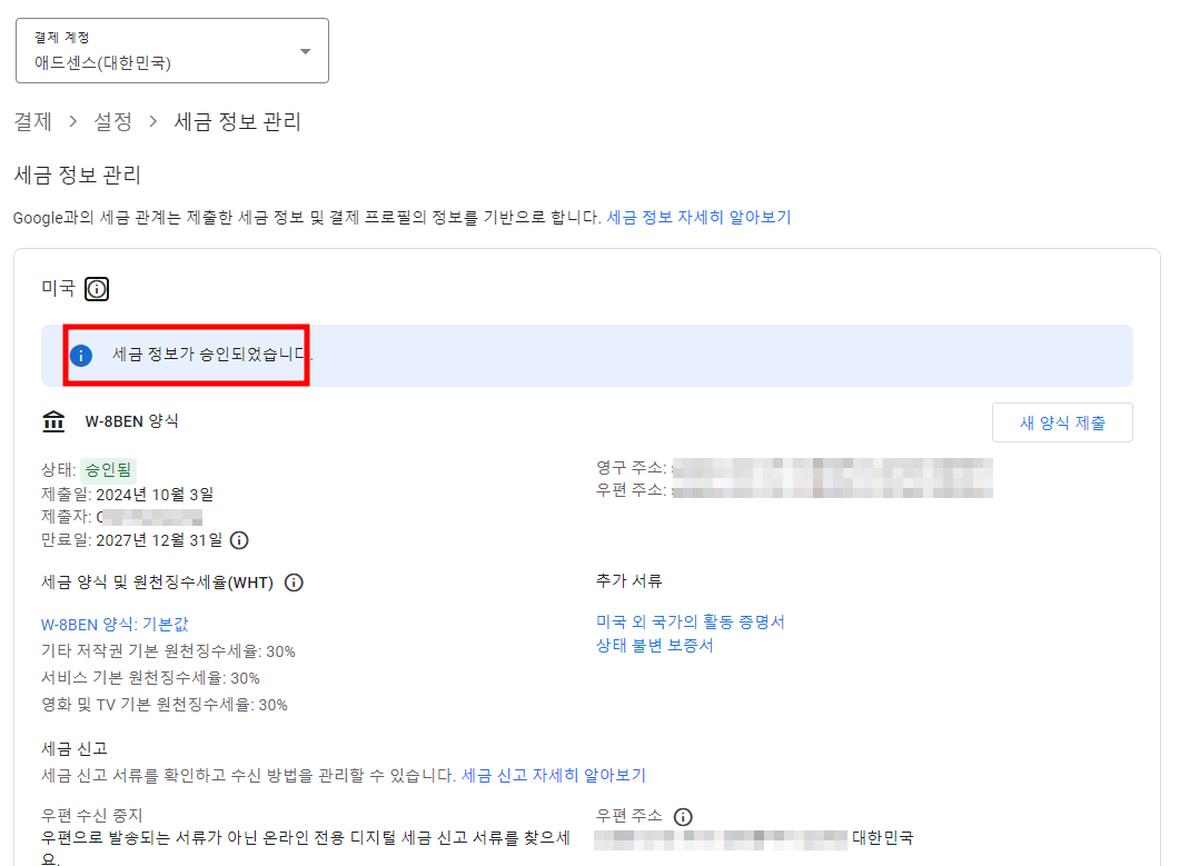 W-8BEN 양식을 제출한 후, 구글 애드센스 시스템에서 이를 검토하는 과정이 진행됩니다. 이 과정은 일반적으로 몇 시간에서 최대 48시간 정도 소요될 수 있습니다. 갱신의 경우, 상황에 따라 즉시 승인 처리되기도 합니다. 검토가 완료되면 세금 정보가 '승인됨'으로 표시되며, 이는 양식이 정상적으로 제출되었음을 의미합니다.