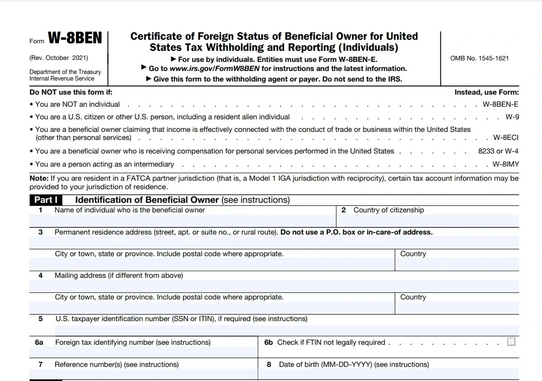 W-8BEN 양식은 미국 외 국가의 거주자가 미국에서 발생한 소득에 대해 세금 혜택을 받기 위해 제출해야 하는 법적 서류로, 미국 국세청(IRS)이 요구합니다. 이 양식은 미국에 본사를 둔 기업이나 플랫폼이 외국 사용자에게 지급하는 소득에 대해 세금을 적법하게 처리하기 위해 반드시 필요합니다. 이는 소득의 성격과 원천에 따라 외국인에게 적용되는 미국 세법상의 원천징수세율을 정확히 결정하기 위함입니다.