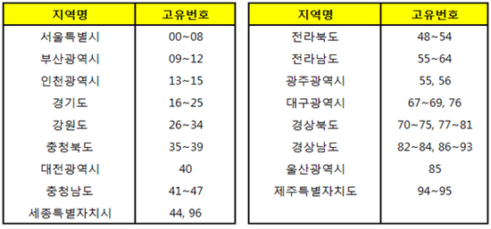 주민번호 뒷자리 광역단체별 지역코드 범위