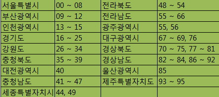 주민번호 뒷자리 광역단체별 지역코드 범위