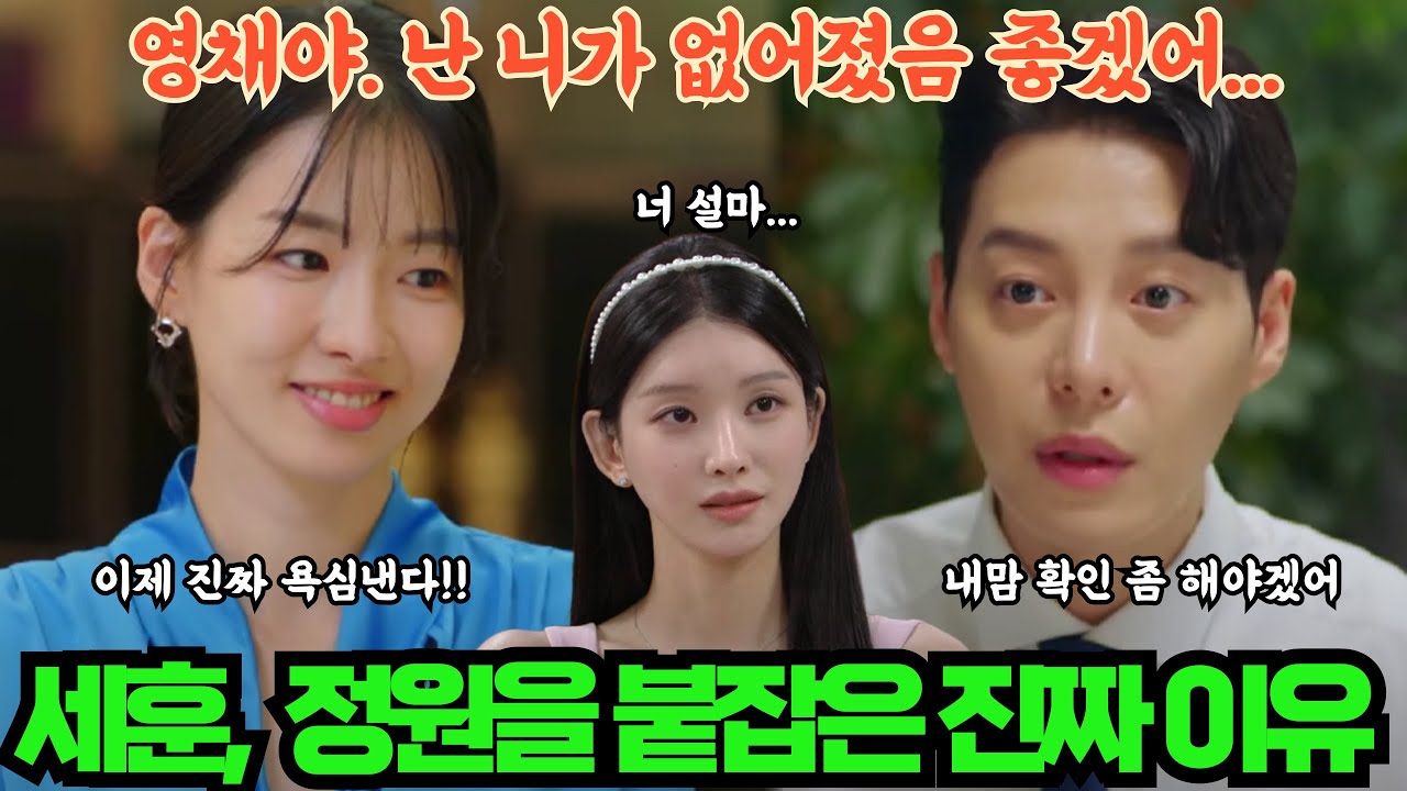- 세훈 입장에서는 외형적으로 안정된 재벌가 후계자지만 내면적으로는 반항심과 공허함이 존재하며, 정원과의 관계가 그 공허를 잠식할 수 있을지, 아니면 더 큰 위기로 이어질지 긴장이 높습니다.