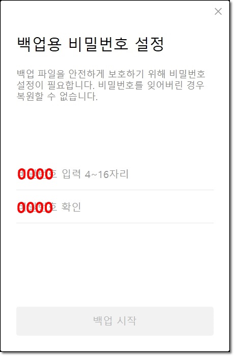 - 백업용 비밀번호를 설정한 후, '백업 시작' 버튼을 클릭합니다.