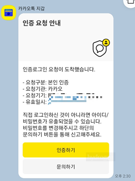- 휴대폰 인증 메시지 수신: "내 PC 인증"을 클릭하면 연동된 휴대폰의 카카오 지갑 앱으로 인증 메시지가 전송됩니다.