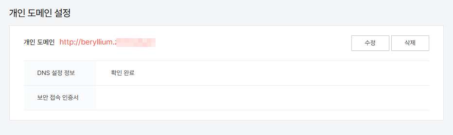 개인 도메인 입력 칸에 조금 전 카페 24에서 생성한 서브도메인을 정확히 입력합니다. 입력 후 변경사항 저장 버튼을 클릭하여 설정을 완료합니다.