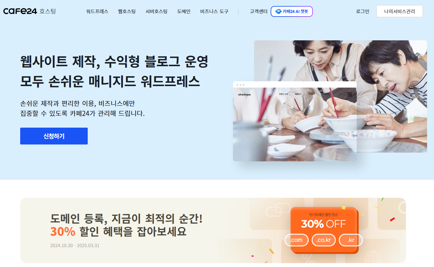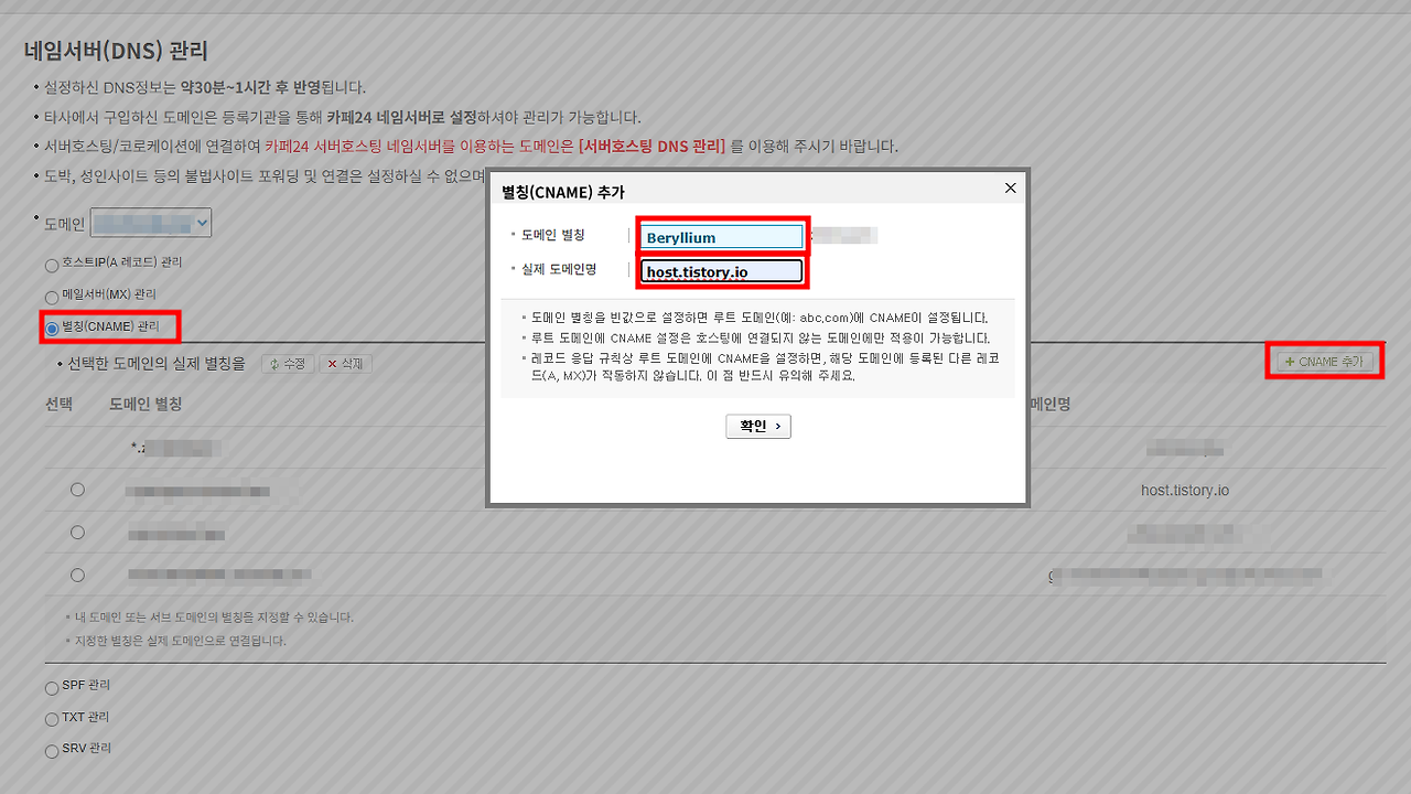 카페 24 매니지드 워드프레스 호스팅 네임서버(DNS) 관리 티스토리 개인 도메인 설정