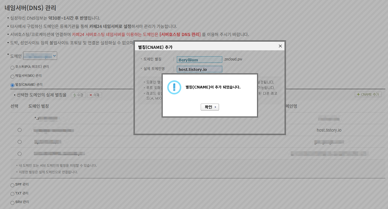 설정을 입력한 후 확인 버튼을 클릭하면 간단히 CNAME 설정이 완료됩니다.
