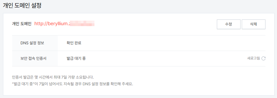 티스토리에서 개인 도메인 설정 이후 보안 인증서 발급이 지연되는 상황에서는 티스토리 고객센터에 문의하여 인증서 발급을 요청하면 됩니다. 요청 시 설정한 개인 도메인 주소를 함께 알려주면 보통 하루 이내에 SSL 인증서가 발급되어 문제없이 사용할 수 있게 됩니다.
