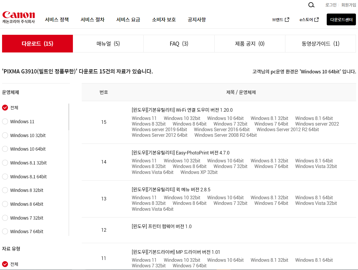 먼저, 캐논의 공식 웹사이트나 아래의 링크를 통해 G3910 드라이버를 다운로드합니다.