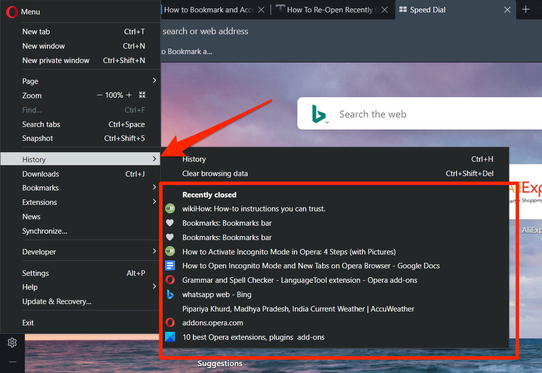 오페라(Opera) 브라우저에서 닫은 탭 열기