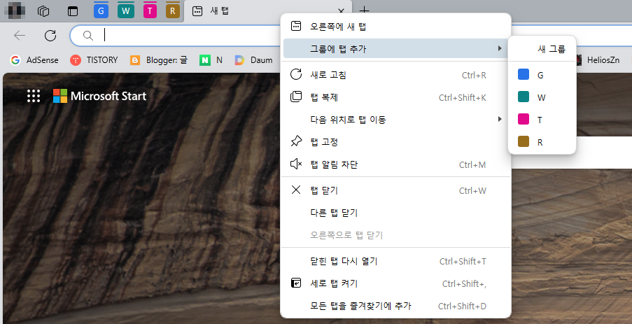 원하는 탭 그룹에서 탭 이름 부분에 마우스 오른쪽 클릭을 합니다.
