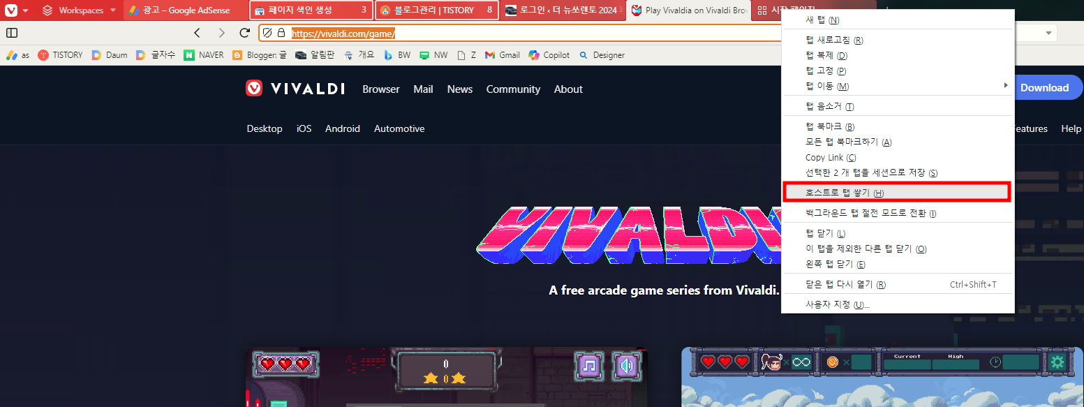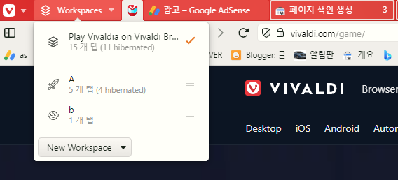 스웨덴 Vivaldi 브라우저 탭 그룹 지정: 가능(호스트로 탭 쌓기), 탭 고정 기능이 있습니다. 탭그룹 저장기능은 없지만, Workspaces 기능이 있어서 활용 가능
