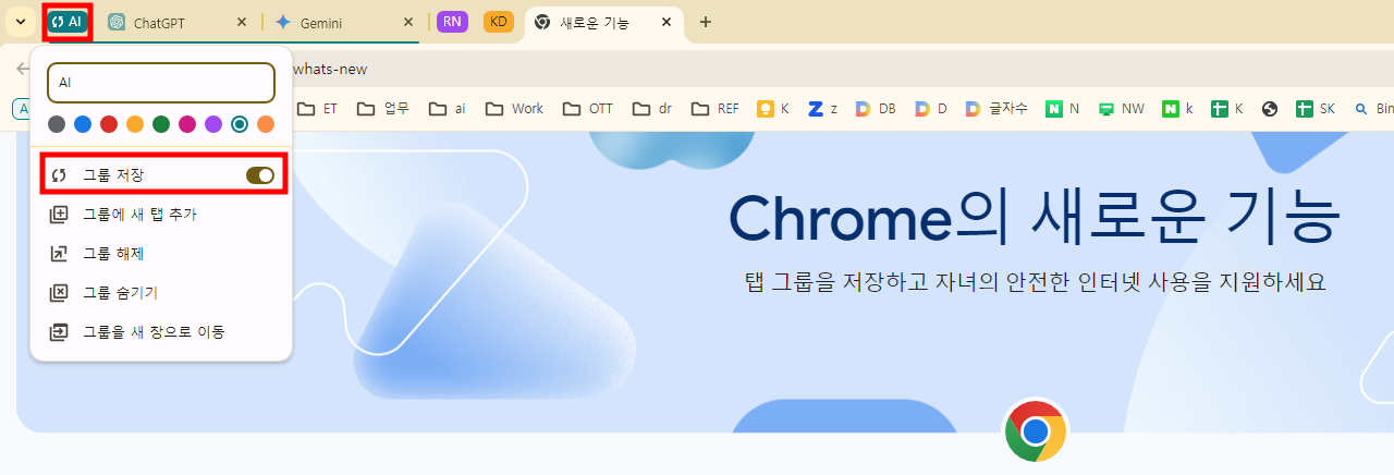 기능 설명: 탭 그룹을 저장하면, 이후에 크롬을 열 때마다 빠르게 해당 탭 그룹에 접근할 수 있습니다. 저장은 탭 그룹에서 마우스 우클릭 메뉴를 통해 "그룹 저장"을 활성화하여 이루어집니다.