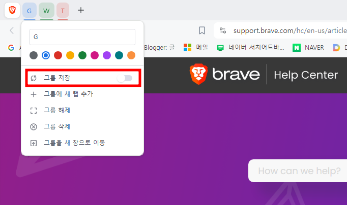 Brave 브라우저 탭 그룹 지정: 가능, 탭 고정 기능이 있습니다. 저장 기능도 있습니다.