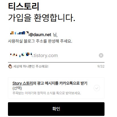 - 블로그 주소(서브도메인) 입력 → [확인] → 환영 팝업(두 번째 스크린샷) → “내 블로그 가기” 선택