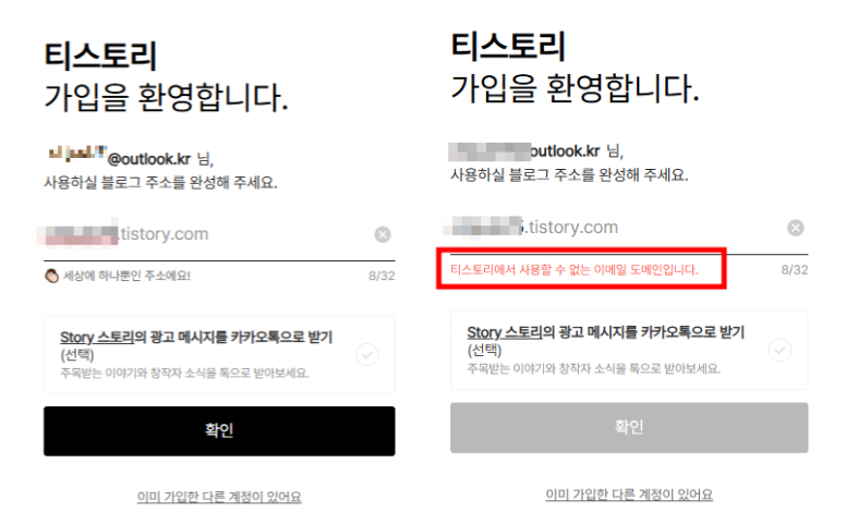 티스토리 계정 outlook.kr, hotmail.com ‘티스토리에서 사용할 수 없는 이메일 도메인입니다.’ 해결방법