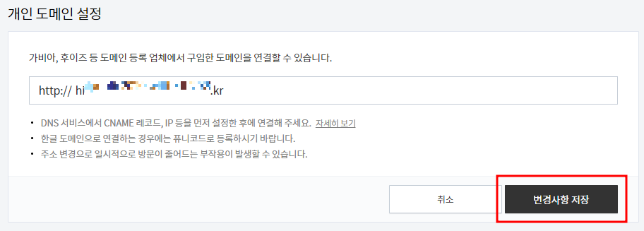 - 개인도메인설정으로 스크롤다운: 메뉴에서 "개인도메인설정"을 찾아 스크롤을 내립니다.
