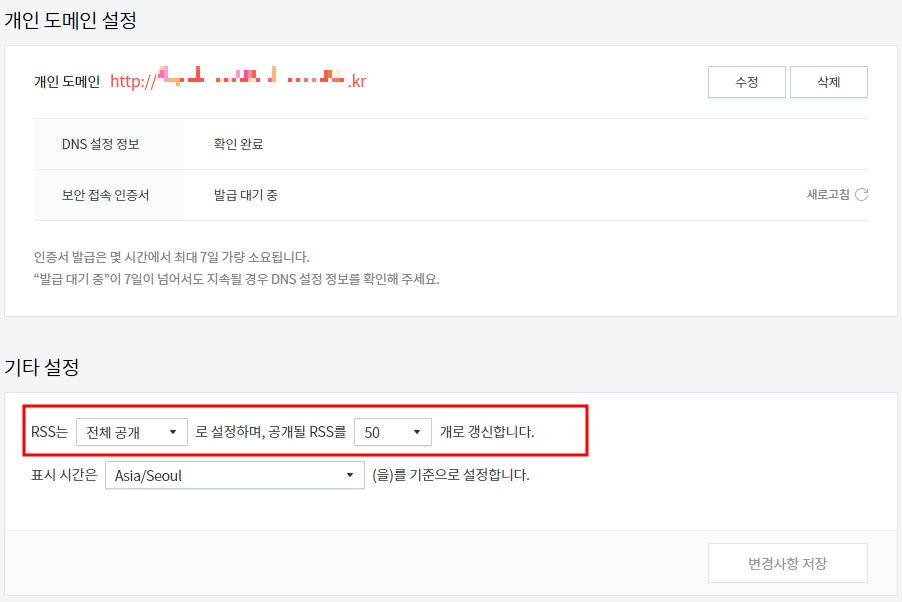 - RSS 설정 원상복구: RSS를 "전체공개"로 다시 설정하고, 공개될 RSS 항목을 "50개"로 늘립니다.