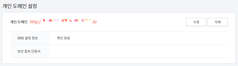 - 개인 도메인 삭제: 먼저 티스토리 "관리-블로그" 메뉴에서 "개인 도메인 설정"으로 들어갑니다. 그리고 현재 등록된 개인 도메인을 삭제합니다.