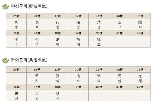 | 전의공파 典儀公派 | 致치 | 錫석 | 浩호 | 樂락 | 燮섭 | 在재 | 鎭진 | 永영 | 植식 | ||||||