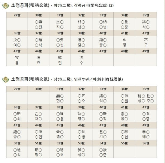 | 소도공파 昭度公派 | 鎭진 | 滋자 | 相상 | 炳병 | 重중 | 錫석 | 汝여 | 植식 | 燮섭 | 載재 | 鍾종 | ||||
