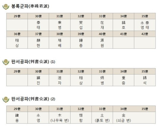 | 봉록군파 奉祿君派 | 泰태 | 秉병 | 燮섭 | 在재 | 鎬호 | 永靈胎태 | 相상 | 顯현 | 培배 | 鐘종 | 源원 | ||||