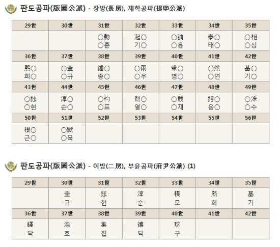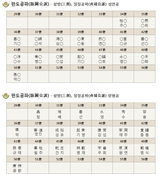 | 야성군파 野城君派 | 東동 | 復복 | 行행 | 相상 | 炳병 | 奎규 | 錫석 | 洙수 | 榮영 | 炯형 | 培배 | 鎬호 | |||