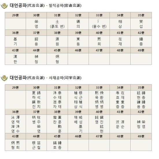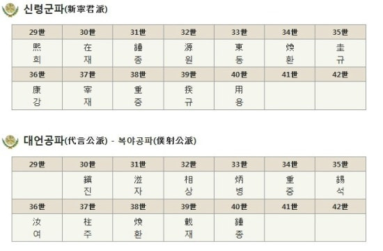 | 봉록군파 奉祿君派 | 泰태 | 秉병 | 燮섭 | 在재 | 鎬호 | 永靈胎태 | 相상 | 顯현 | 培배 | 鐘종 | 源원 | ||||