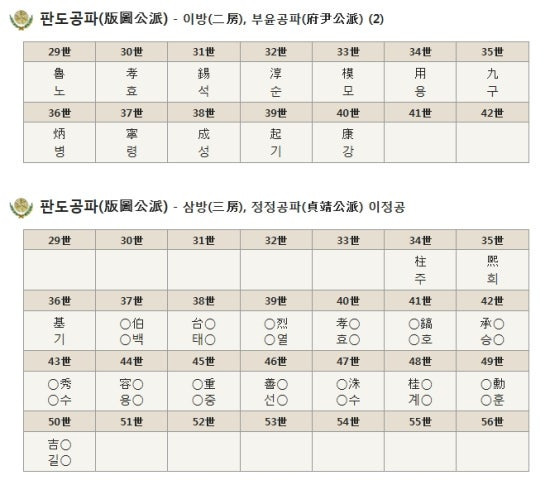 | 야성군파 野城君派 | 東동 | 復복 | 行행 | 相상 | 炳병 | 奎규 | 錫석 | 洙수 | 榮영 | 炯형 | 培배 | 鎬호 | |||