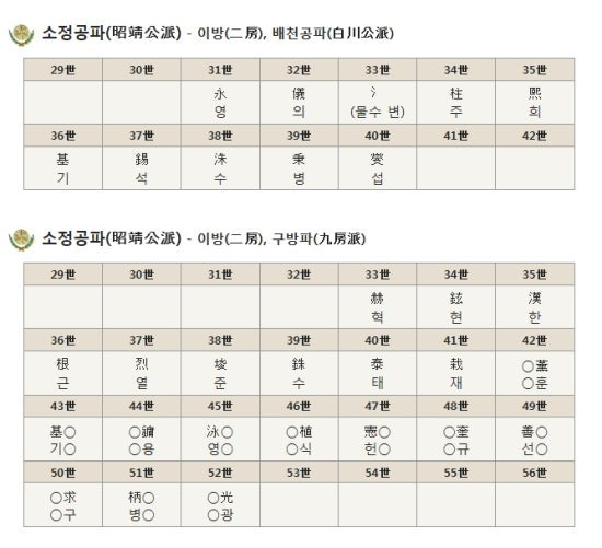 | 소도공파 昭度公派 | 鎭진 | 滋자 | 相상 | 炳병 | 重중 | 錫석 | 汝여 | 植식 | 燮섭 | 載재 | 鍾종 | ||||