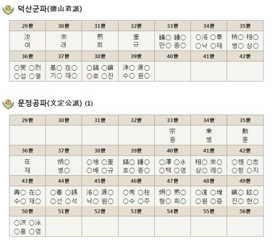 | 덕산군파 德山君派 | 汝여 | 來래 | 熙희 | 奎규 | 鍾종 | 泰태 | 相상 | 烈렬 | 在재 | 斗두 | 一일 | ||||