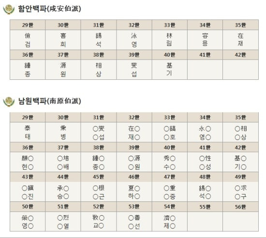 | 남원백파 南原伯派 | 泰태 | 秉병 | 燮섭 | 在재 | 鎬호 | 永영 | 相상 | 顯현 | 培배 | 鐘종 | 源원 | 秀수 | |||