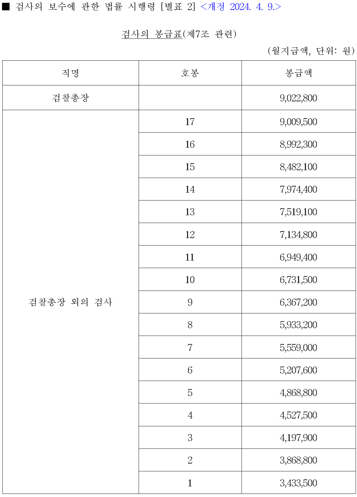 검사의 봉급표 (2024.4.9 기준, 단위: 원)