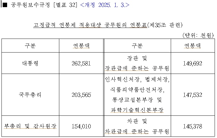 대통령 연봉은 공식 발표 자체가 연봉으로 발표됩니다. 2억 6천만 원이고요. 헌법재판소장과 대법원장은 기본급으로 표기되어서 1,312만 원을 월급으로 받습니다. 12배 해봐야 2억 6천에 훨씬 못 미치는 것처럼 보이지만, 헌법재판소장과 대법원장은 대한민국 국가 의전 서열 3위입니다. 3위지만, 사법부의 공동 수장이지요. 국회의장이 2위고요. 이 삼부요인의 급여는 연봉으로 환산 시 동일합니다. 헌법재판소장이나 대법원장도 법에 빠삭한데, 대통령보다 1원이라도 적게 받았다면 헌법소원이라도 걸었을 것입니다. 봉급표 상에 검찰총장 따리와 같은 위치에 표기돼 있어서 하찮은 검찰총장 따위와 동급으로 보시면 안 됩니다. 물론 대한민국에서 검찰총장은 대통령도 해 처먹고, 계엄도 막 하고, 내란도 일으킬 중요한 보직이긴 합니다.