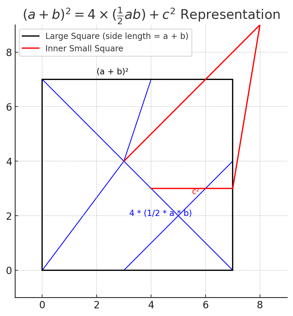 - 큰 정사각형의 면적은 (a + b)²로 계산되며, 이 면적은 네 개의 직각삼각형의 면적과 작은 정사각형의 면적의 합으로도 표현할 수 있습니다.