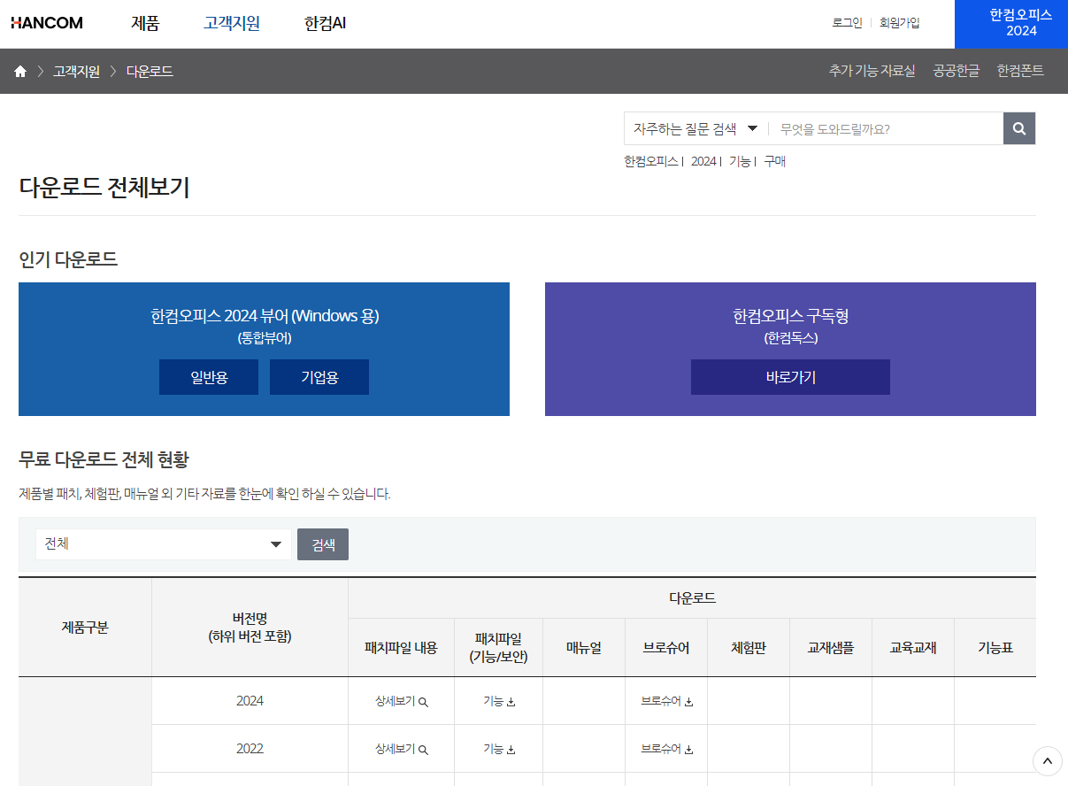 한컴 오피스 공식 다운로드 페이지 이용하기