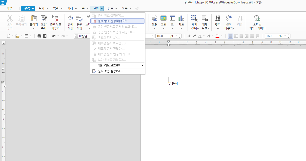 - 문서암호 변경/해제 옵션 선택: '문서암호 변경/해제'을 선택합니다.