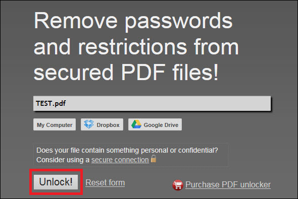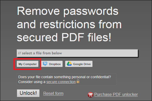 - 파일 선택: 사이트에 접속한 후 "My Computer" 버튼을 클릭하여 보안 해제할 PDF 파일을 선택합니다. 파일을 선택하기 위해서는 해당 파일이 컴퓨터에 저장되어 있어야 합니다.