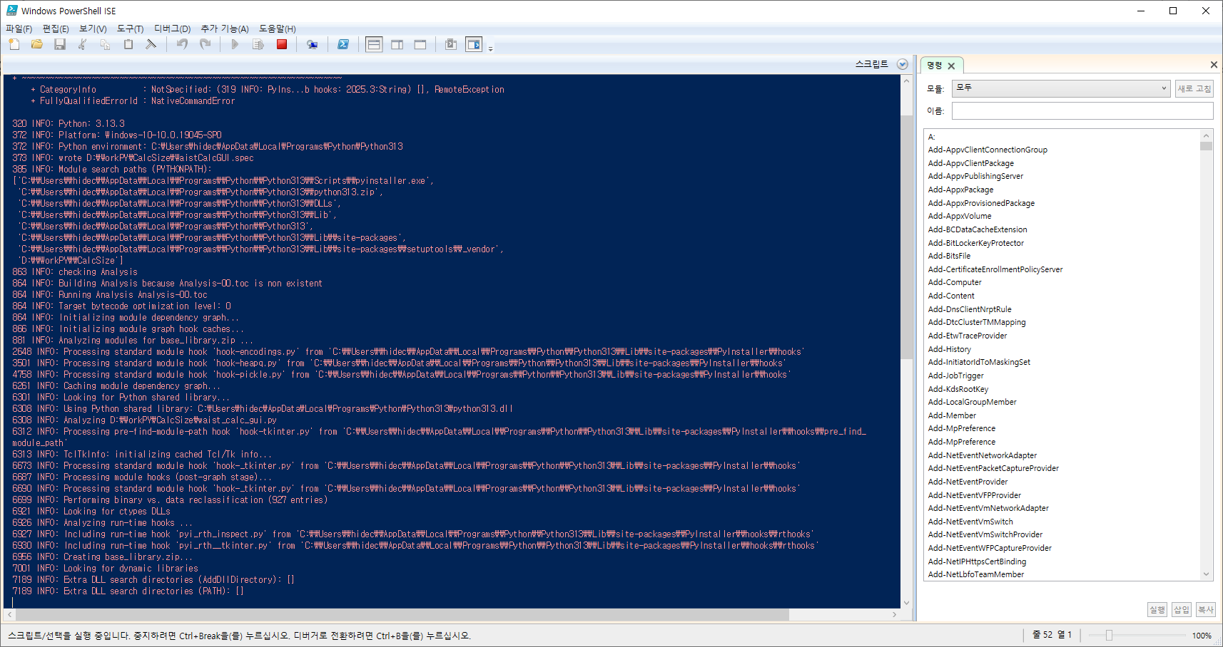 --onefile: 모든 의존성을 단일 실행 파일로 묶음--windowed: 콘솔 창 없이 GUI 전용 실행--name WaistCalcGUI: 생성될 EXE 파일명 지정
