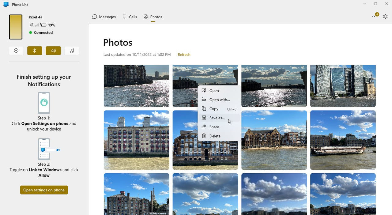 - Windows의 Phone Link와 휴대폰을 페어링하면, 사진 미리보기 및 저장이 가능.
