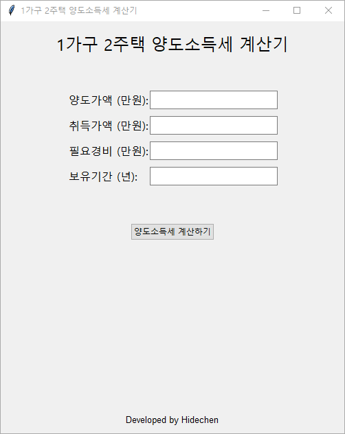 앞서 1가구 2주택 양도소득세 계산 방법을 상세하게 다뤘는데요, 이번에는 보다 쉽게 양도소득세를 계산할 수 있는 GUI 형태의 프로그램을 파이썬으로 제작하는 방법을 소개하겠습니다. 프로그래밍에 익숙하지 않은 분들도 쉽게 따라 할 수 있도록 순서대로 설명드리겠습니다.