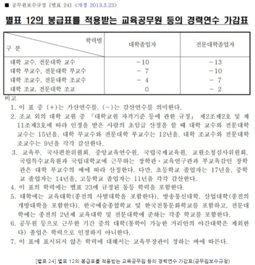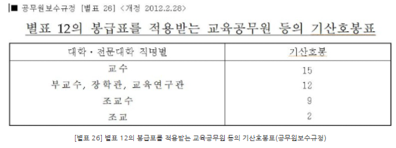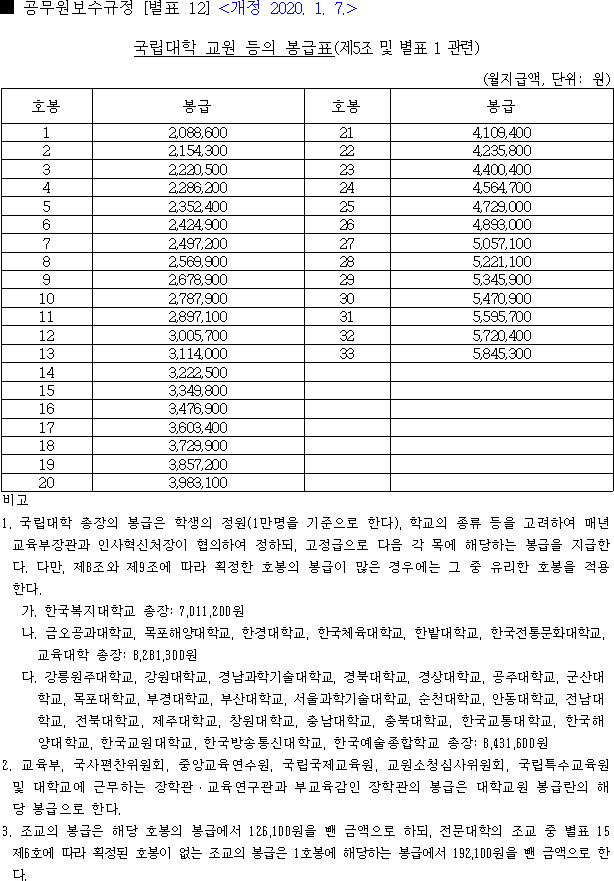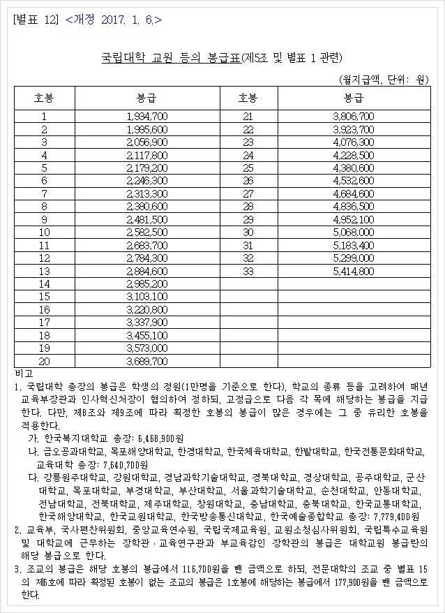 이 표는 국립대 조교 월급을 표현하기도 합니다. 즉, 이 표를 가지고 국립대 조교 연봉은 물론이고 2021 국립대 조교수 연봉도 계산해 낼 수 있습니다. 이 표만 본다면 조교도 호봉이 높으면 교수하고 별 차이가 없겠군요. ㅋ (조교로 평생 썩을 리는 없겠지만...) 다만 위의 3항에서 보다시피 국립대 조교 월급은 위의 호봉표 해당 호봉에서 2021년의 경우에는 12만 7천300원을 뺀 금액을 월급으로 지급합니다. 전문대학교 조교중 별포 15 제6호에 따라 확정된 호봉이 없으면 19만 3900원을 뺀 금액이 월급으로 지급됩니다.