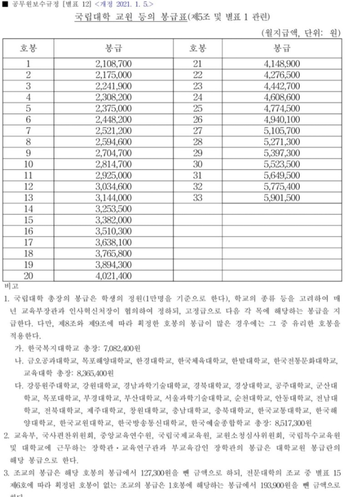 2021년 국립대 교수 연봉 월급과 교원 대학 조교 월급