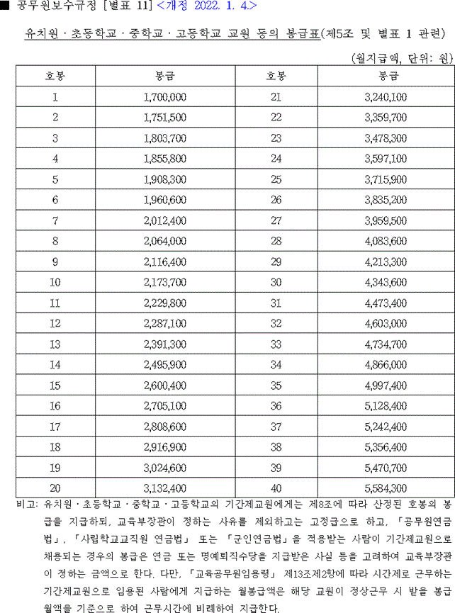 2022년 경찰공무원 봉급표 2022 교사 호봉표 '22년도 공무원 월급표