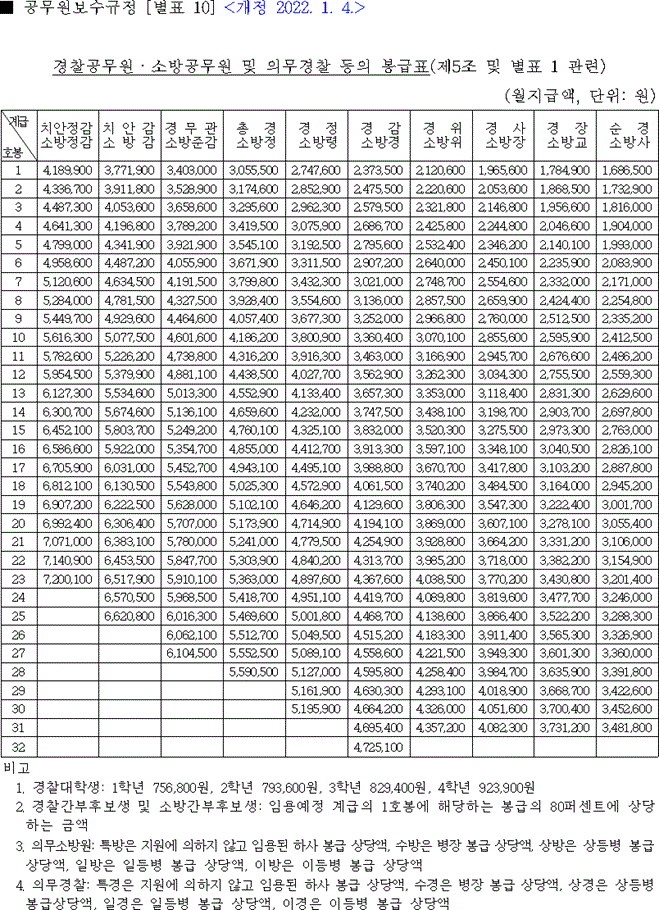 22년도 경찰공무원 봉급표 2022 소방공무원 봉급표