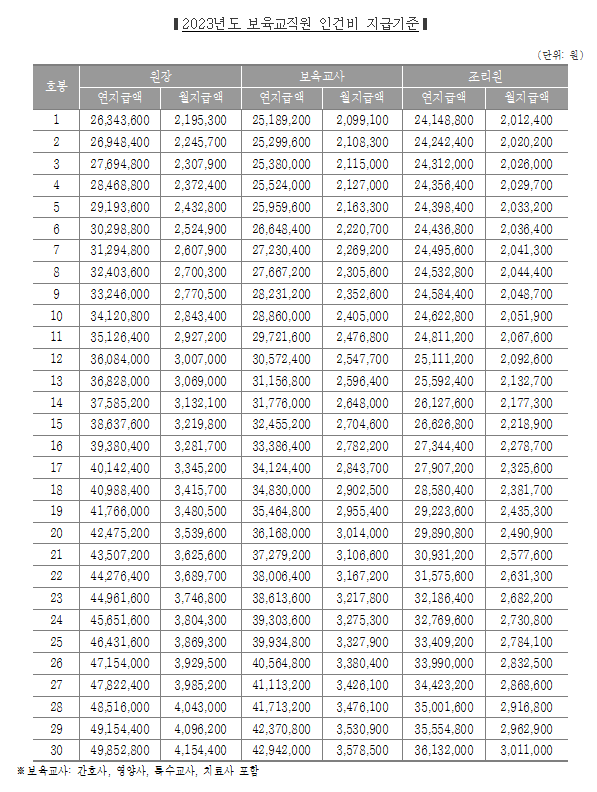 2023년 보육교사 호봉표