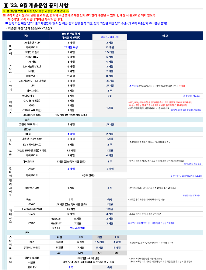 이상으로 2023년 9월 현대차 및 기아차의 출고대기기간에 대한 정보를 공유해 드렸습니다. 감사합니다!