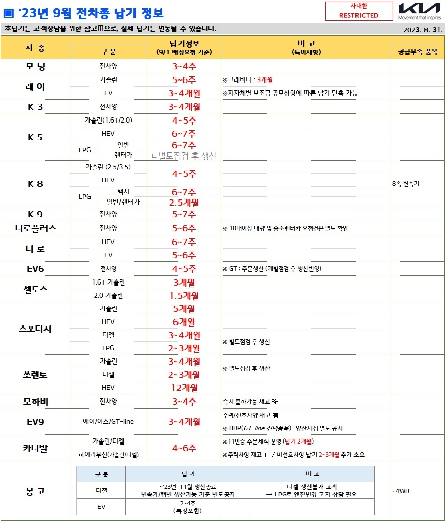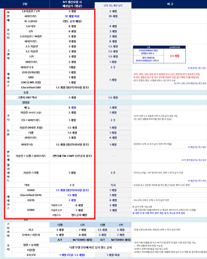 이상으로 2023년 9월 현대차 및 기아차의 출고대기기간에 대한 정보를 공유해 드렸습니다. 감사합니다!
