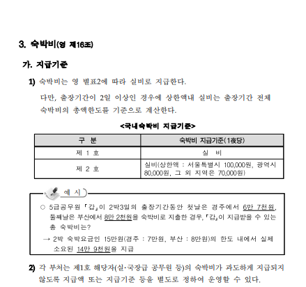 - 숙박비: 관내 출장은 일반적으로 숙박을 필요로 하지 않으므로 숙박비가 지급되지 않습니다. 그러나 예외적으로 숙박이 필요한 경우에는 사전 승인을 받아 실비로 정산할 수 있습니다. 이러한 경우는 보통 긴급한 상황이나 예기치 못한 일정 변경으로 인해 발생하며, 모든 사항에 대해 상급자와의 협의를 거쳐야 합니다.