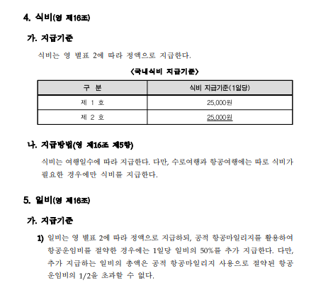 - 일비와 식비: 관외 출장 시 일비는 20,000원, 식비는 25,000원으로 책정되었습니다. 이는 공무원들이 출장 중 필요한 기본 경비를 보전하기 위한 금액입니다. 일비는 출장지에서 발생하는 여러 작은 경비들을 보전하기 위한 것으로, 이에 대한 사용 내역도 자세히 기재해야 합니다.